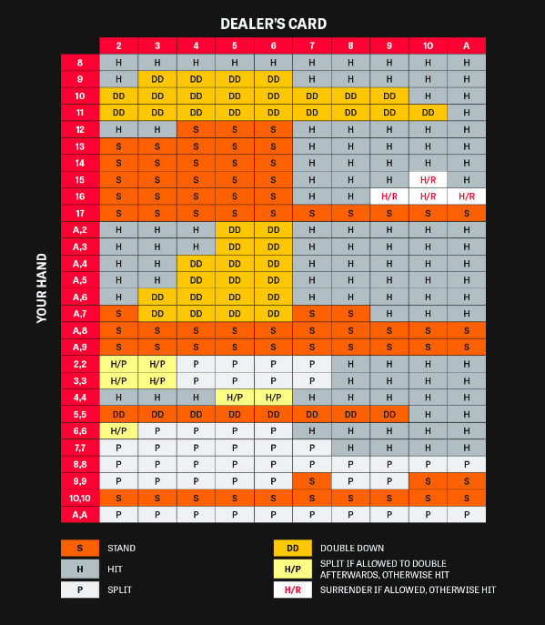 Making this decision is not always easy, which is why we have prepared a comprehensive Blackjack strategy chart to guide in every hand. The advantage of playing at an online casino is that you can use the strategy at any time unlike in land-based ones where it is prohibited. The chart below will help you to master the decision with possible wins when playing at any Blackjack table: