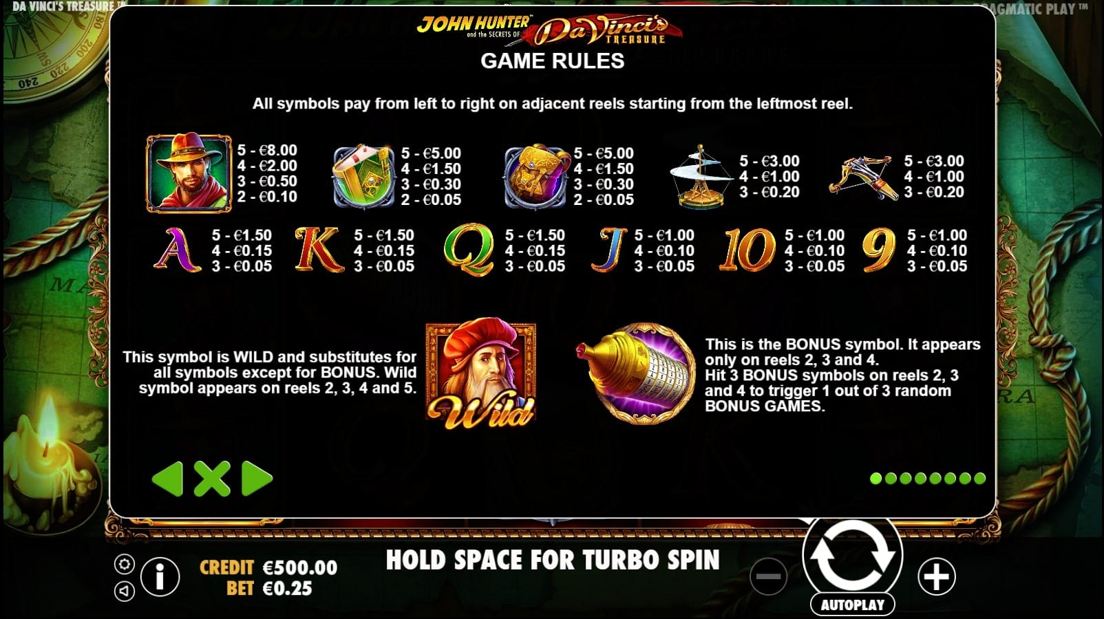 And here we go – Pragmatic dared to pay homage to this legendary Italian erudite in John Hunter and the Secrets of Da Vinci’s Treasure – their latest slot game.