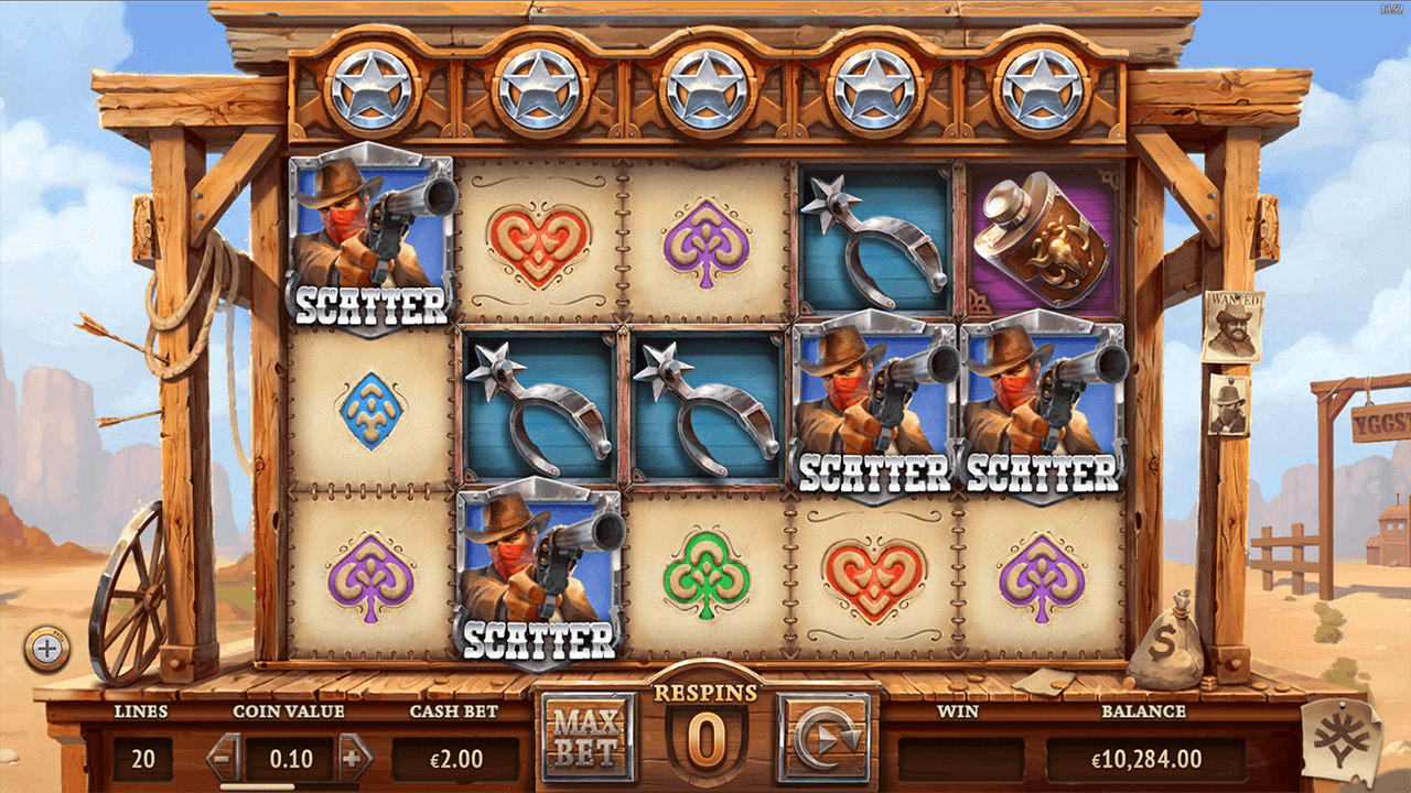 As far as special symbols are concerned, there are scatters represented by outlaws and wilds that appear in the form of sheriff badges.