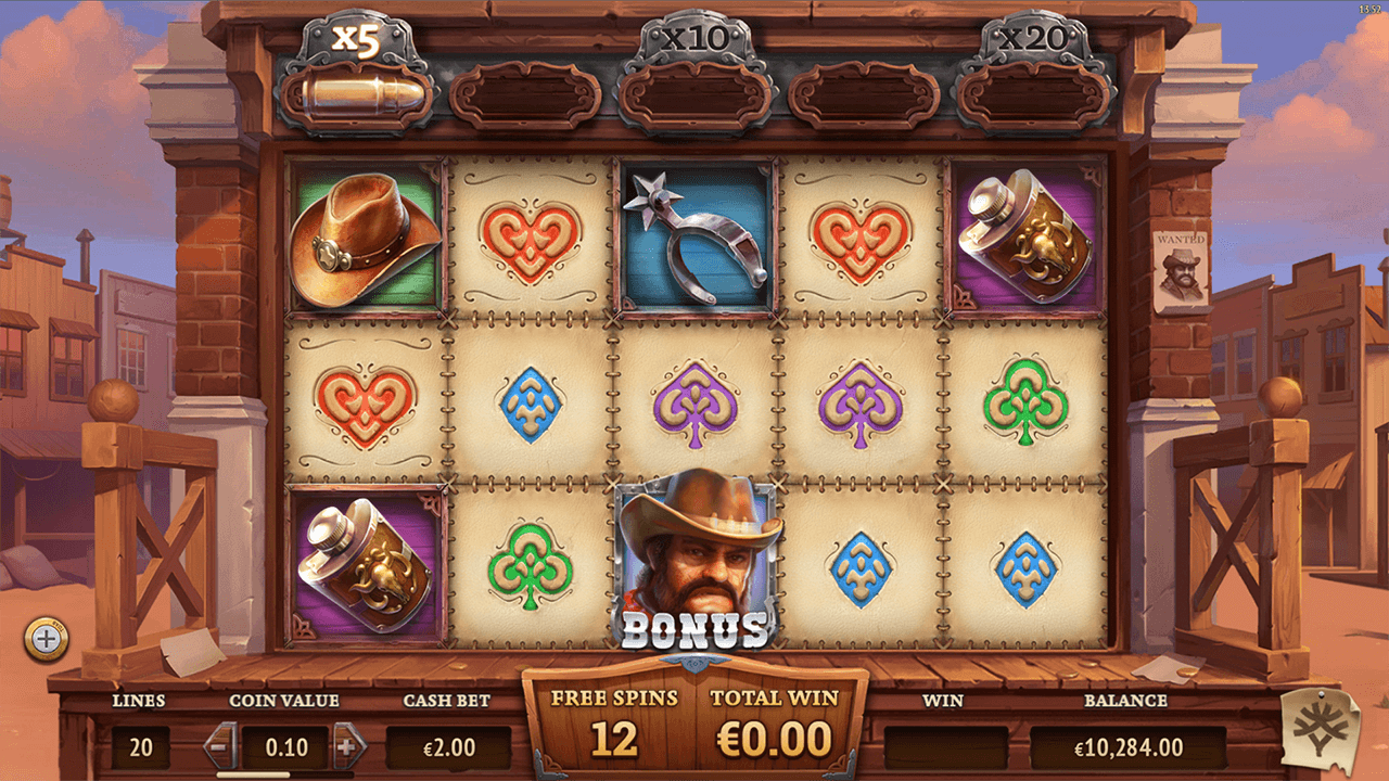 It’s a hot Wild West town that swarms with lawlessness and where the sheriff’s means to restore order on the streets seem to have fallen flat on their faces. That said, if your cowboy or cowgirl soul is eager for the wild battle, the residents of the wretched town are waiting for their hero! Your main armoury is prepared and comes in the shape of the game’s symbols – shiny spurs, cowboy hats, flasks with booze and pistols. The latter will serve you best by rewarding with the highest payouts on offer – 80x your stake for 5 of a kind.