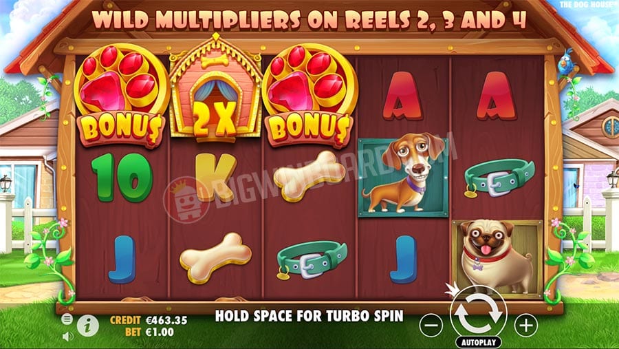 The centerpiece of the Dog House slot is wilds empowered to multiply wins by 2x and 3x. In the free spins round, these multiplier wilds are bound to work even greater wonders for your game. This is because they will pop up and remain in place to grant you a chance to benefit from a shower of winning combos. So be on the lookout for 2x and 3x sticky multiplier wilds on the 3 middle reels in the bonus game.