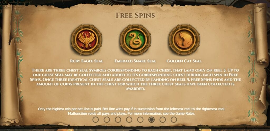 The beetle with golden wings acts as a wild and replaces all symbols, but a scatter, collect symbols and a chest seal. If you are fortunate enough to land 5 wilds, you will scoop a formidable chunk of money – 150x your wager!