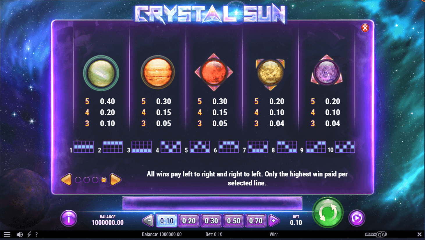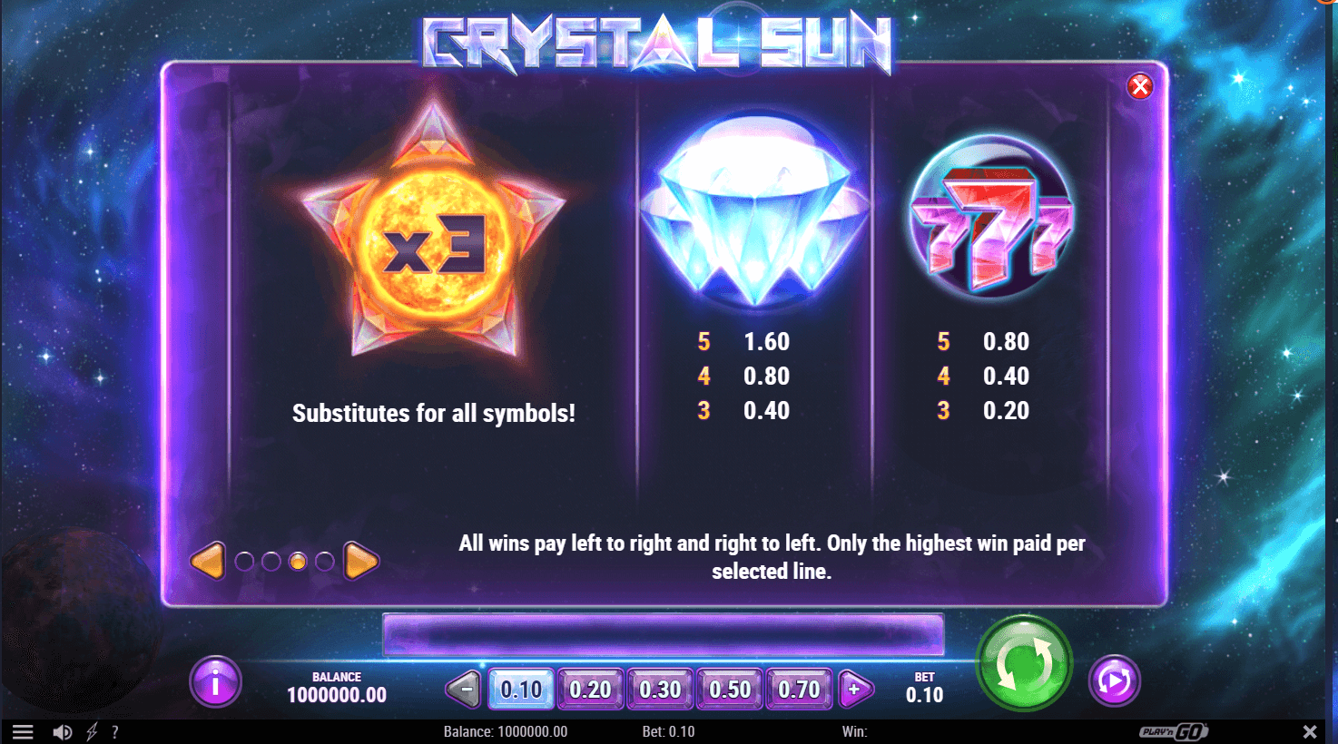 Play’N Go takes you on an unforgettable ride deep beyond the boundaries of the planet Earth. Here, in the vast and unexplored universe, you will be gazing at shiny stars, sparkling dust and cosmic rays. Also, in the middle of this awe-inspiring site, you will spot a 5×3 reel formation filled with beaming celestial bodies. They compellingly float with the rhythms of the cosmic sounds to imbue you with the utmost curiosity and the feel that you are an umbilical part of the wonderful universe! Boy, there is a wow feel to how the Crystal Sun Slot looks and sounds.