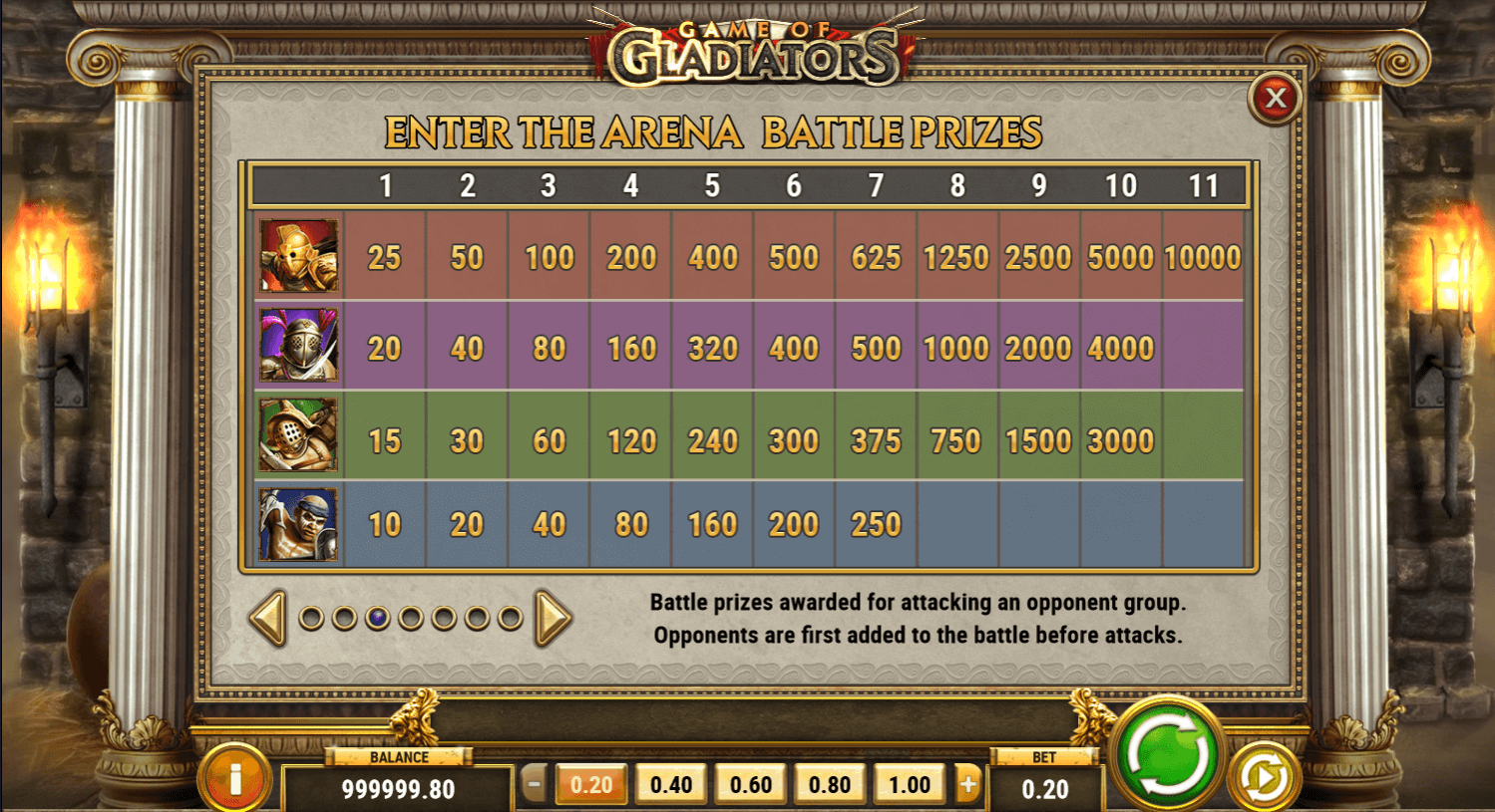 • The fame bonus game: A gladiator will be picked at random. If he wins, he is rewarded as per the Battle Prize paytable