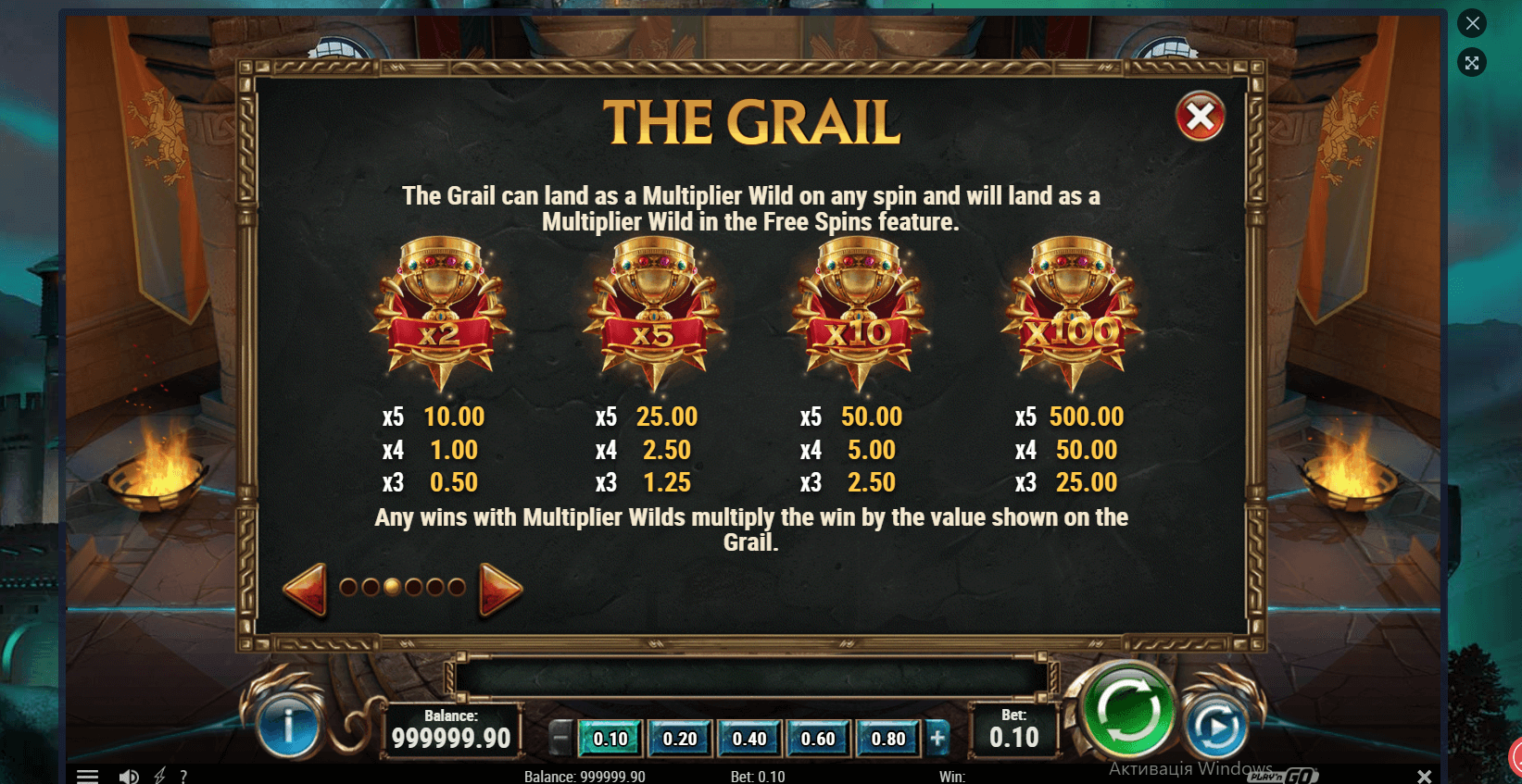 To start off with, the main attraction in this magnificent game is the wild symbol represented by Holy Grail. Apart from paying you cash, 3,4 or 5 Holy Grail wilds have you reap the wins of 2,5x, 5x or 50x your wager, respectively, they can also multiply your wins like no one’s business. To be more frank, even in the base game wilds can appear with 2x, 5x, and a colossal 100x multiplier.